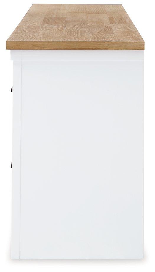 Casual style with substance. This two-tone TV stand raises the bar on comfortably cozy design. A sturdy silhouette with a butcher block oak veneer top, classic white finish and contemporary black metal hardware exudes modern farmhouse vibes. The spacious cabinet, display shelves and drawers let you tuck away entertainment essentials while displaying treasures in this charmingly curated piece. Cutouts for wire management help keep the look relaxed and uncluttered.