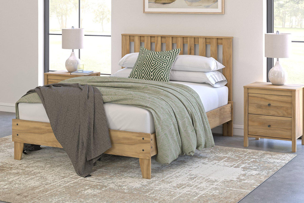 This queen platform bed puts the dream of a casual bedroom retreat beautifully within budget. A warm light brown finish over replicated hickory grain exudes a homey vibe. It’s a simply relaxed way to achieve the sanctuary of your dreams without needing a foundation or box spring.