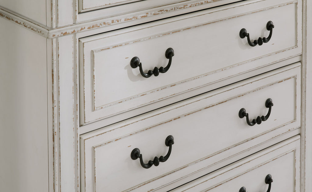 Traditional design. Casual appeal. You can have it all with this chest of drawers. A relaxed two-tone aesthetic merges with ornate profiled drawer fronts and pilasters to give the distinctive piece an allure all its own. Expansive drawers with quality dovetail construction and dark bronze-tone hardware reflect attention to detail from the inside out.