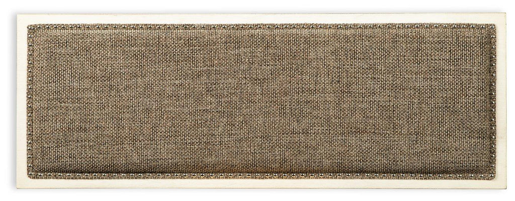 The beauty of this upholstered dining bench is something to savor. Serving up comfort and flair, this generously scaled counter-height bench entices with a cushioned seat covered in a heavy woven fabric that complements the antiqued white finish.