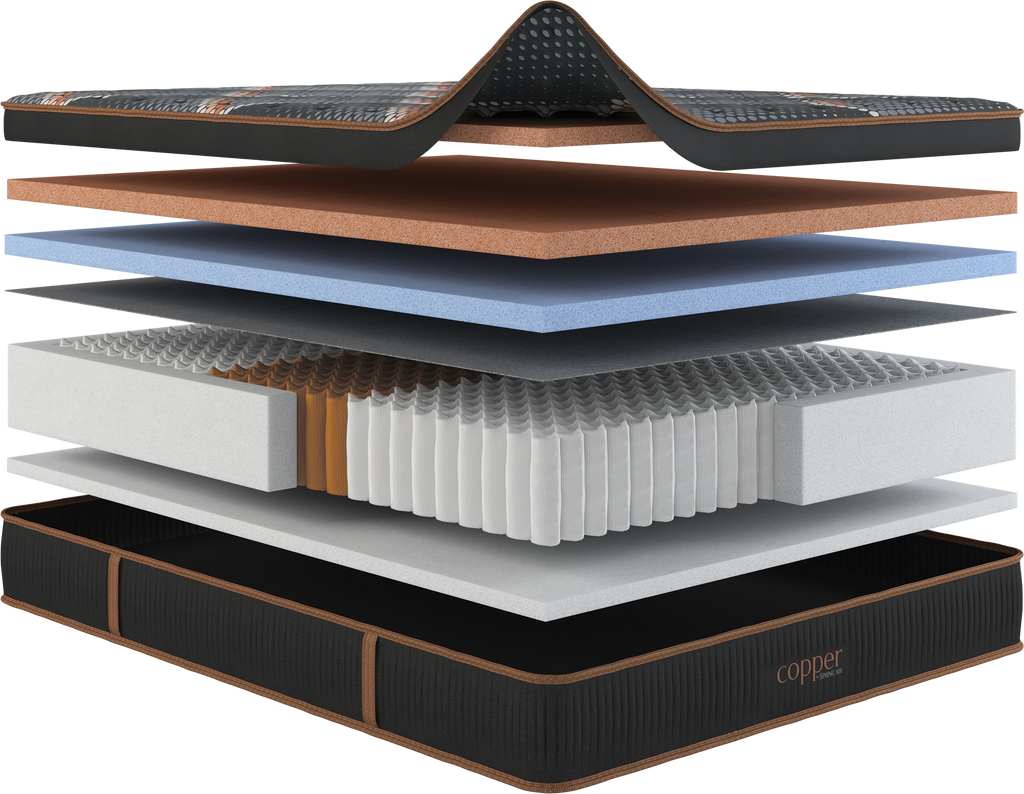 Copper Hybrid Plush Eurotop delivers structured comfort with temperature regulating copper and adaptive layers designed to promote deeper sleep and total pressure relief every night. Featuring a NatuVerex Copper Infused Cooling Cover for breathable freshness, this mattress supports clean rest from the top down. Beneath, adaptive support layers minimize pressure and promote structure. Made in the USA for dependable durability and next-level performance night after night.