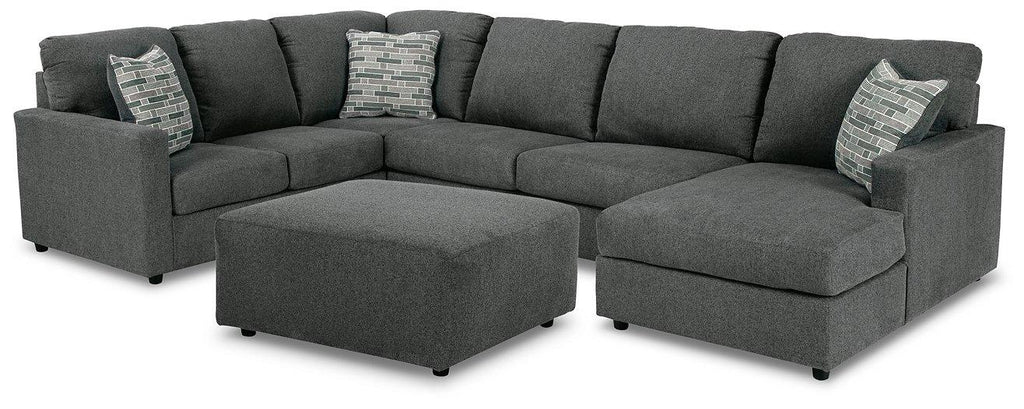 Contemporary fashion, meet superior form. This sectional and ottoman package is strikingly streamlined in design. Cozy cushions invite superior relaxation, while handsome charcoal upholstery speaks to tried-and-true modern color palettes. Simply kick back, relax and settle into the calm of your curated space.