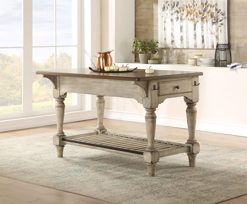 - Distressed two-tone whitewash wood finish with tabletop surface in a dark wood finish