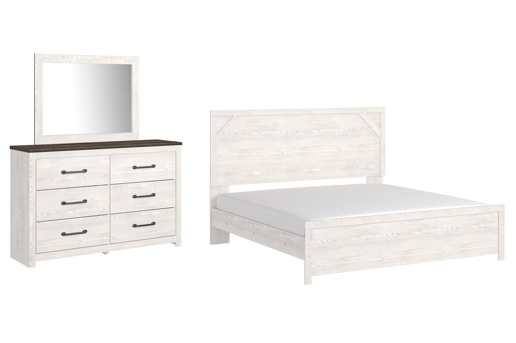 Cool, clean and casually modern. This bedroom package's wispy whitewash and gray finish sets the tone for your calming sanctuary. The bed’s framed elements and cross-brace accents add dimension and authenticity to its simply stunning profile. Smooth-gliding drawers on the storage pieces neatly accommodate your storage needs.