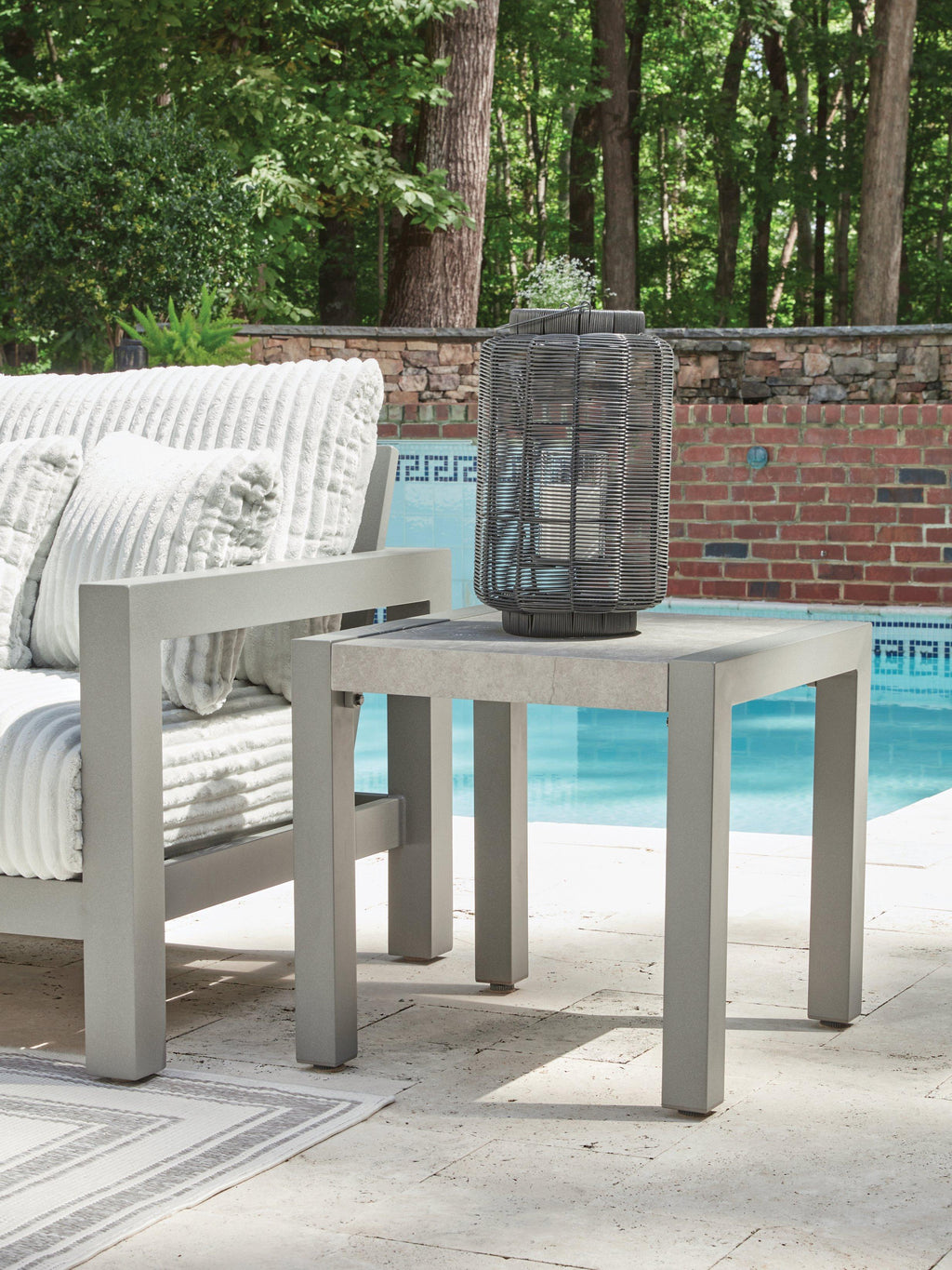Indulge in luxe outside living without sacrificing longevity. This outdoor end table combines natural beauty with a sleek aluminum frame. Soak up the sun poolside or on the porch—it’s the perfect perch for your drink or latest read. And with a chic gray stone tabletop, style and durability go hand in hand.
