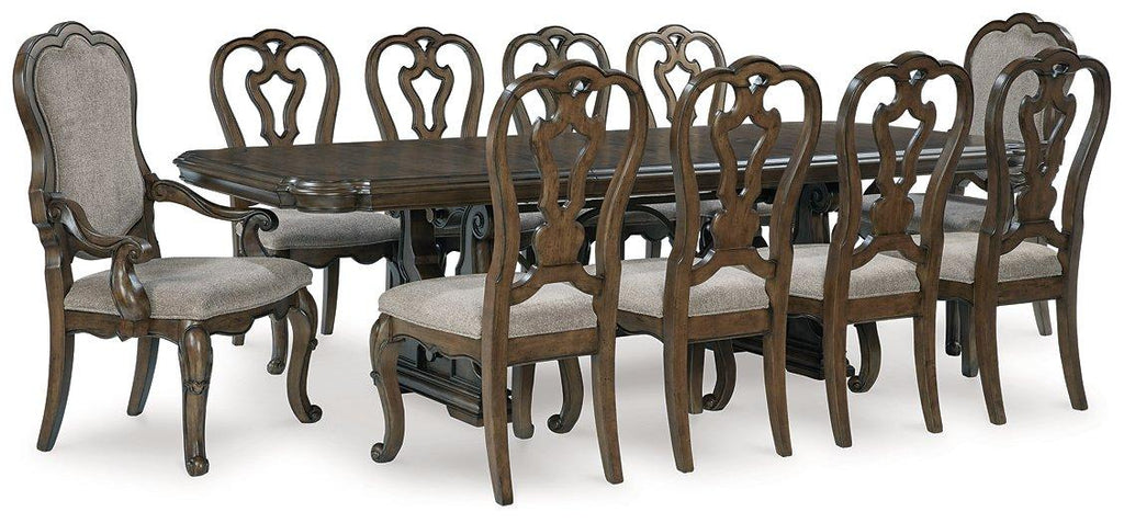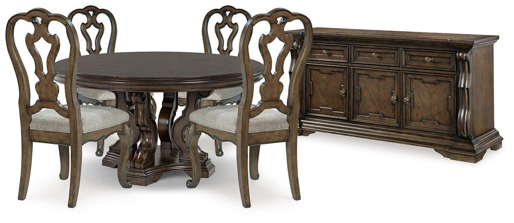 From its ornamental appliques to its large scale, this dining package makes a bold statement. With ornate details, the opulent set wows with stunning style. The look is timeless. The feel? Right at home.