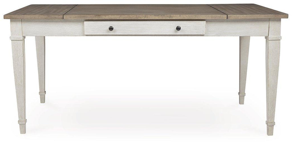 Set the scene for coastal chic or modern farmhouse living with this dining room table. Clean-lined, simply striking table doubles the charm with a brown tone top with plank effect, paired with a grayish white base with rub through effect for timeworn appeal. Multi-functional dining table features two convenient side drawers and a storage bin on each end for maximum use of space. Styled to comfortably seat six, this table makes room for one and all.