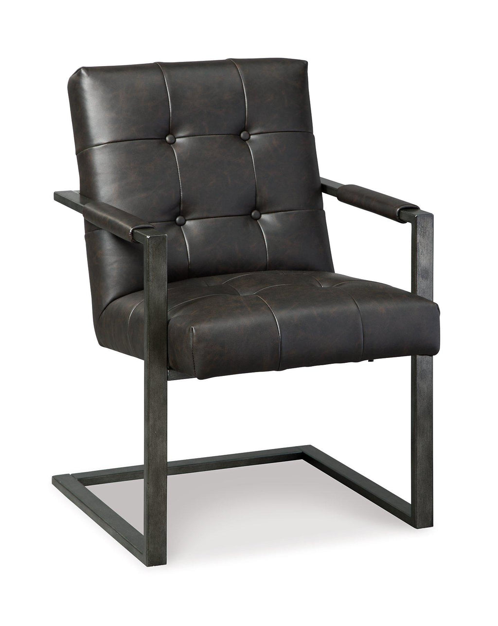 For fans of urban industrial design, this chair steals the show. Its metal C-frame in a blackened gunmetal finish is sleek, sculptural and ultra modern. Crafted for looks and comfort, the tufted box seat, wrapped in a ‚Äúweathered‚Äù faux leather upholstery, is loaded with retro chic flair. Whether paired with Starmore’s home office desk or dining room table, it’s a feast for the eyes.