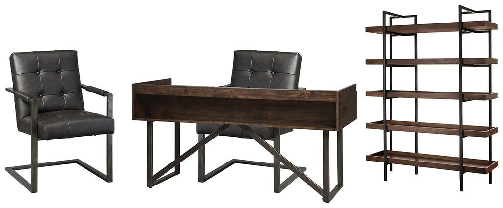 For fans of urban industrial design, this home office set steals the show. The desk and bookcase are crafted with a mix of acacia veneer and wood beautified with an oiled walnut-tone finish. Sleek metal frames and linear accents on the pieces work so well together. The chairs' tufted seats, wrapped in a “weathered†faux leather upholstery, are loaded with retro-chic flair. Gallery-style elements on the pieces stack up to great form and function.