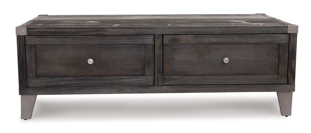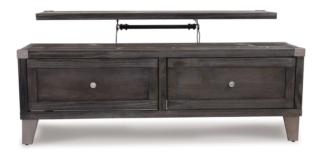 Mixed material lift top table truly elevates rustic-industrial style. Weather-washed pine wood and veneers are contrasted with canted metal legs and corner bracket accents for a uniquely chic merger of earthy beauty and contemporary flair. A handy spring-loaded mechanism brings the tabletop to you, while two drawers with removable storage trays are packed with possibilities.