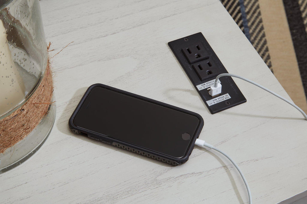 Add big character to a small space with this chairside end table. With its compact size and strong silhouette, it can go anywhere and blend easily into the decor. Less is so much more with the Shaker-inspired design and gray wood tone finish. Loaded with form and function, this end table displays accent pieces and stores essentials securely while keeping devices powered up.