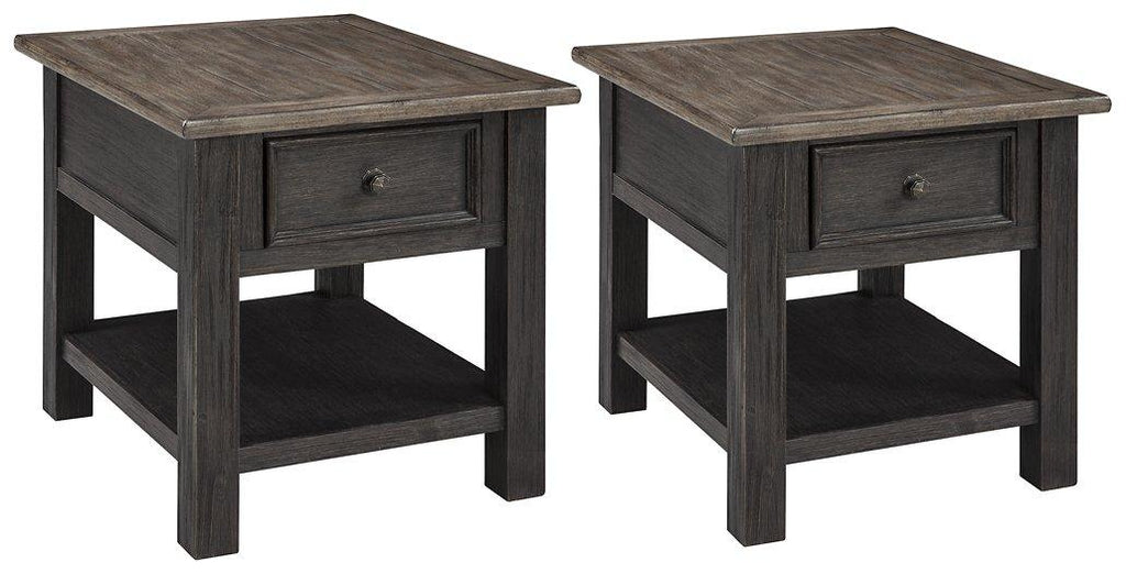 Shabby chic with a hint of down home country. This 2-piece rectangular end table with textured black finish is all the talk of today’s design world. Wood grain shows through the weathered gray-brown top in all of its earthy pleasure. Framed drawer is adorned with lovely traditional hardware.